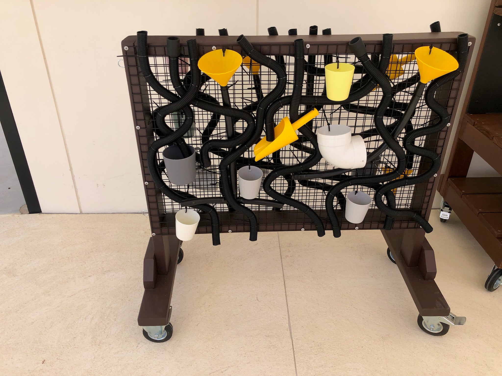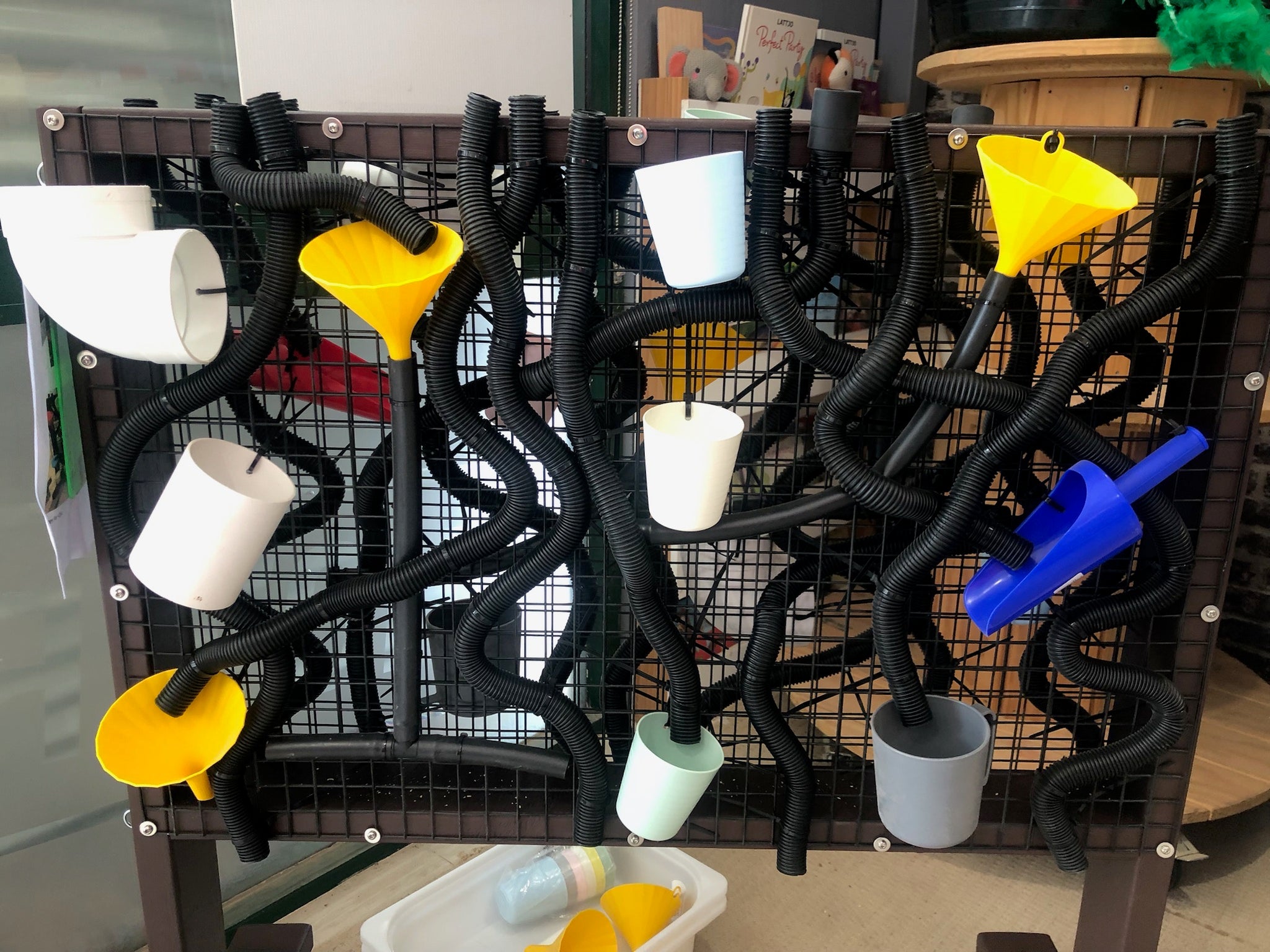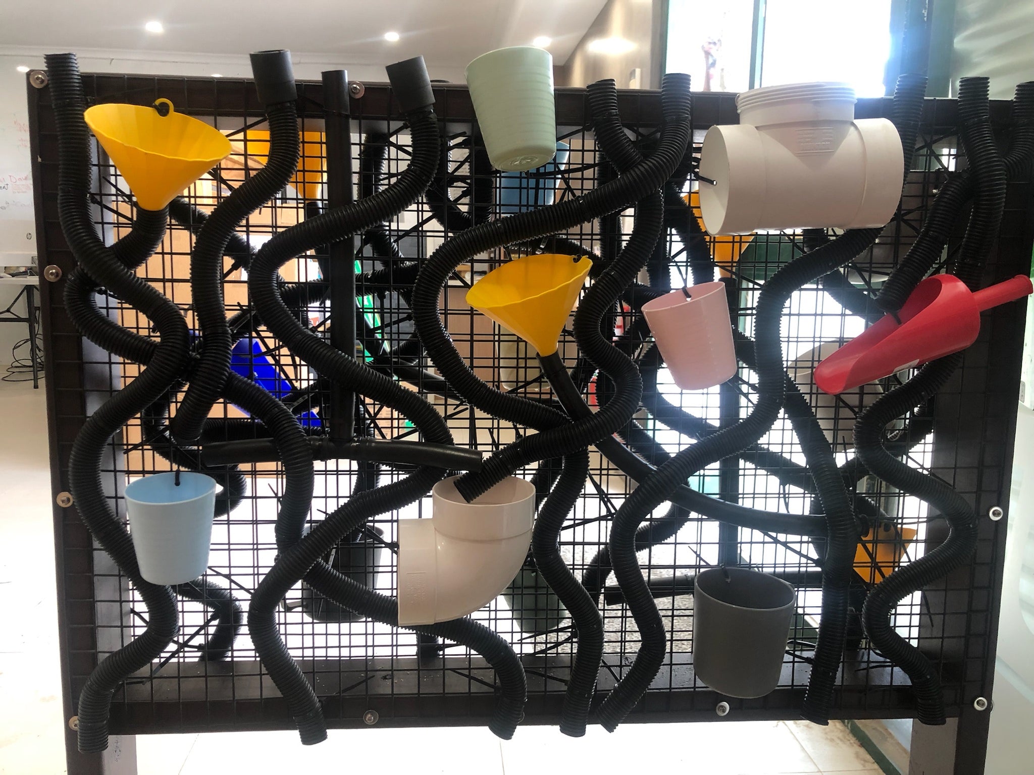 The Waterwall provides opportunities for children to investigate and experiment with the Science concepts of “flow and motion”. The collection of hose pipes and funnels allows for children to follow the water down the various paths. Bright and engaging for the children to learn through play.